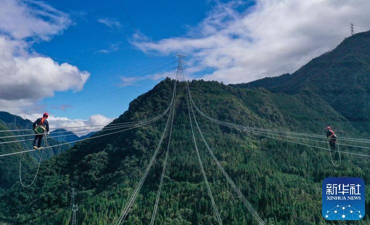 10月18日,在四川省雅安市天全縣喇叭河鎮(zhèn),技術人員在導線上進行質(zhì)檢工作(無人機照片)。新華社記者 王曦 攝