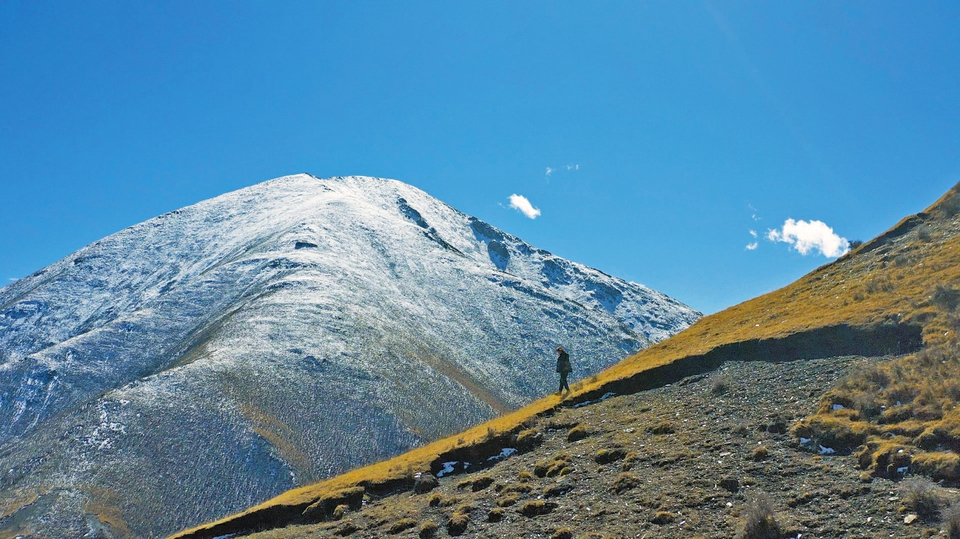 10月23日早晨,姜楠備好望遠(yuǎn)鏡、相機(jī)、水,準(zhǔn)備上山,同行的還有藏族同事扎拉和一位藏族牧民,任務(wù)是為云塔村3座小山上的紅外相機(jī)更換電池。這里的山并不高,但因高原氧氣稀薄,增添攀登難度。山間未完全融化的雪跡,也讓山路濕滑難走。