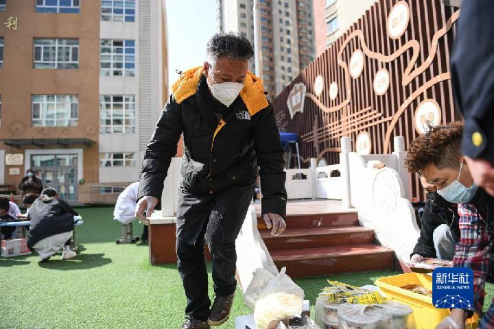 10月31日,羅宗周正在為西寧勝利路一社區(qū)核酸采樣點送愛心餐。新華社記者 吳剛 攝