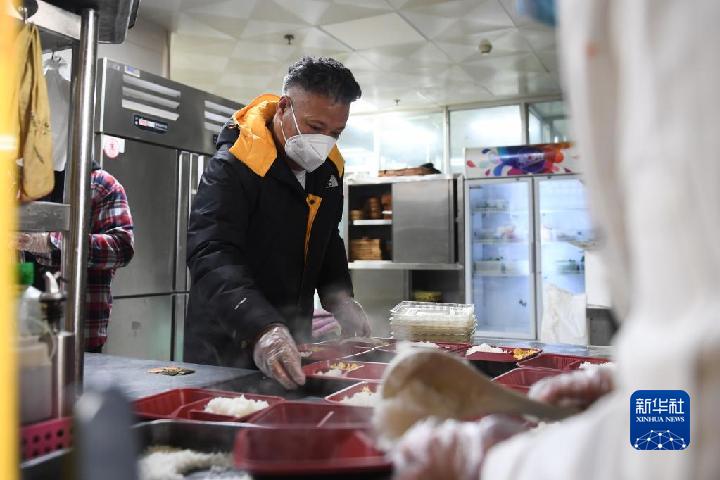 10月31日,羅宗周正在為西寧勝利路一社區(qū)核酸采樣點送餐。新華社記者 吳剛 攝