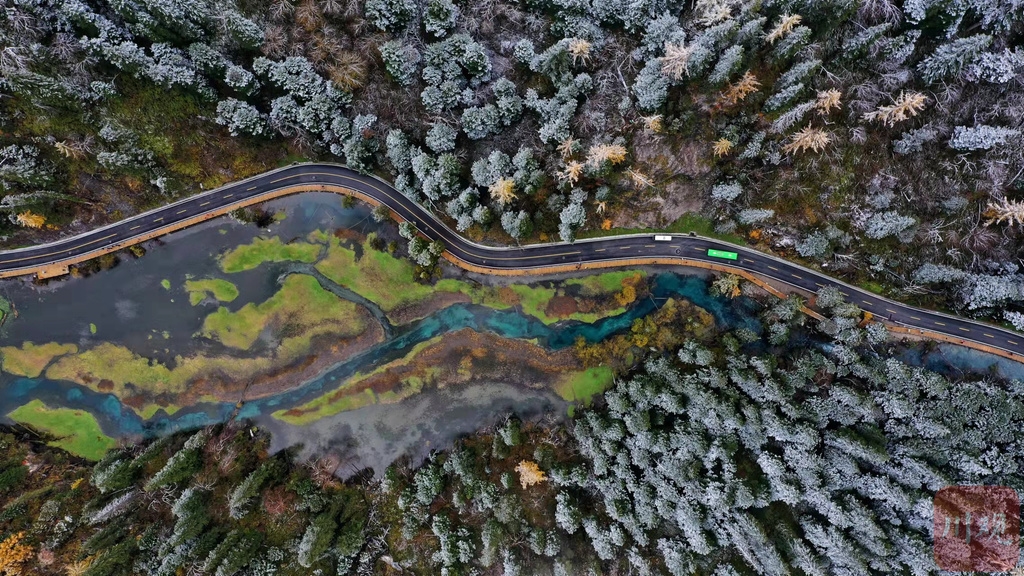 交替時節(jié),四川各地眼下已融合成了多姿多彩的天然調(diào)色盤,或是彩林錯落,或是銀裝素裹,彩林與白雪相遇相擁,半山彩林半山雪的景致讓人無限向往。