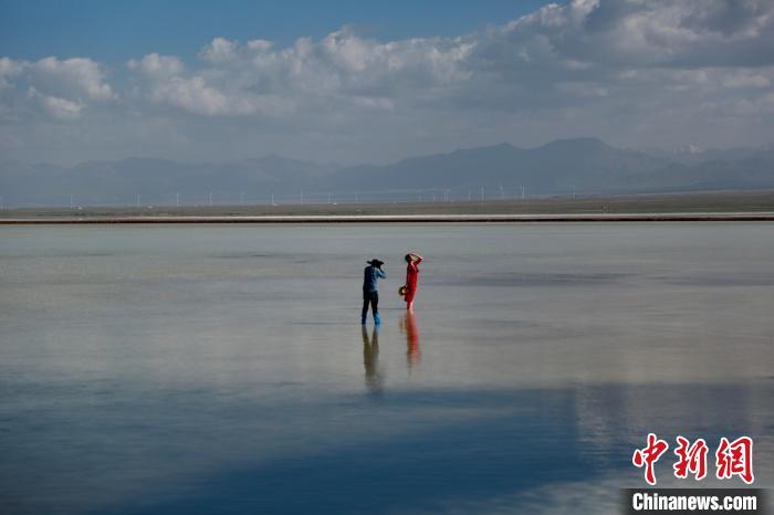 圖為游客在鹽湖中拍攝。馬翔 攝