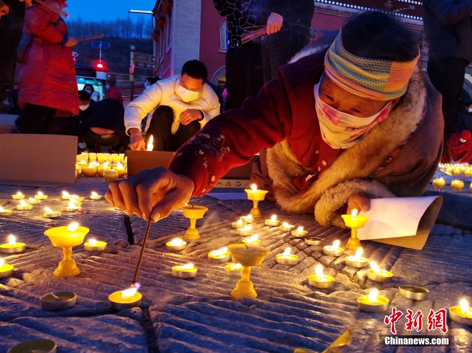 記者在塔爾寺內(nèi)看到,裹著藏袍的藏傳佛教信眾,扶老攜幼,在寺院山門處的標(biāo)志性建筑八寶如意塔周圍的地面燃燈,并在高原冷風(fēng)中虔誠(chéng)守護(hù)。