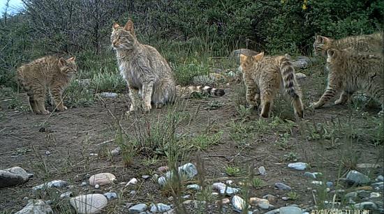 這是布設(shè)在祁連山國(guó)家公園青海片區(qū)的紅外相機(jī)拍攝到的5只荒漠貓同框畫面(2020年7月3日攝)。新華社發(fā)(祁連山國(guó)家公園青海省管理局供圖)