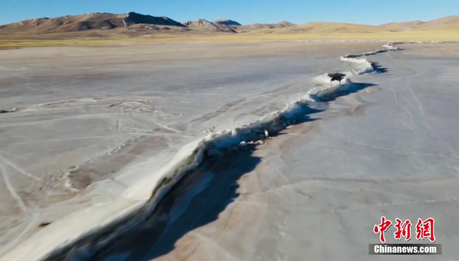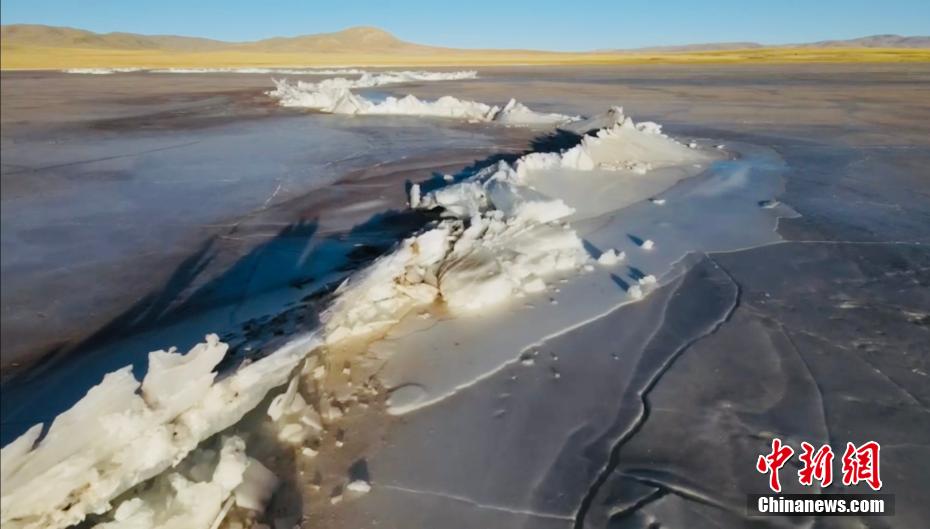當(dāng)?shù)財z影愛好者用無人機(jī)航拍了班德湖封湖的壯美景色,如同冰上長城。吐旦丹巴 攝