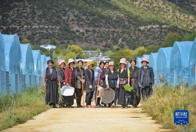 2021年10月22日,郎達村村民在得榮縣藥材種植示范基地內(nèi)合影。 新華社記者 劉坤 攝