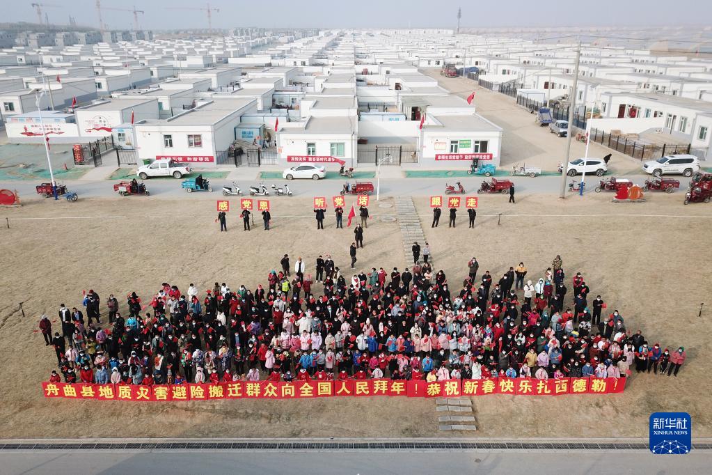 在蘭州新區(qū)舟曲避險搬遷安置點,搬遷群眾向全國人民拜年(1月24日攝,無人機(jī)照片)。新華社記者 范培珅 攝