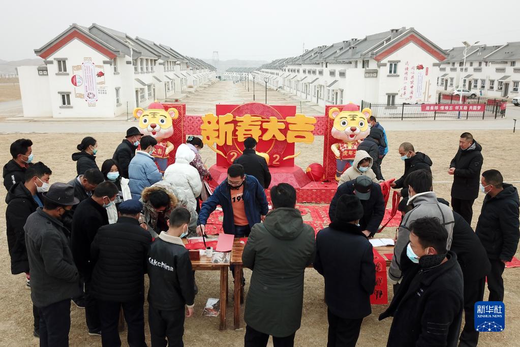 1月25日,在蘭州新區(qū)舟曲避險搬遷安置點,舟曲地質(zhì)災(zāi)害避險搬遷第一臨時黨支部組織書法家給搬遷群眾送春聯(lián)(無人機(jī)照片)。新華社記者 范培珅 攝
