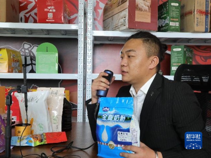 1月25日,網(wǎng)絡(luò)主播騰格爾在直播間為粉絲們介紹來(lái)自家鄉(xiāng)的農(nóng)畜產(chǎn)品。新華社 央秀達(dá)珍 攝