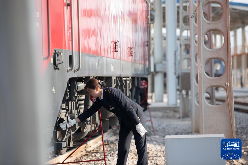 張夢(mèng)晨在出乘前檢查機(jī)車。馬鵬 攝