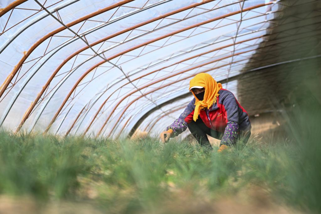 3月23日,藥農在青海省海西蒙古族藏族自治州德令哈市柯魯柯鎮(zhèn)的藏紅花大棚內除草。新華社記者 張龍 攝