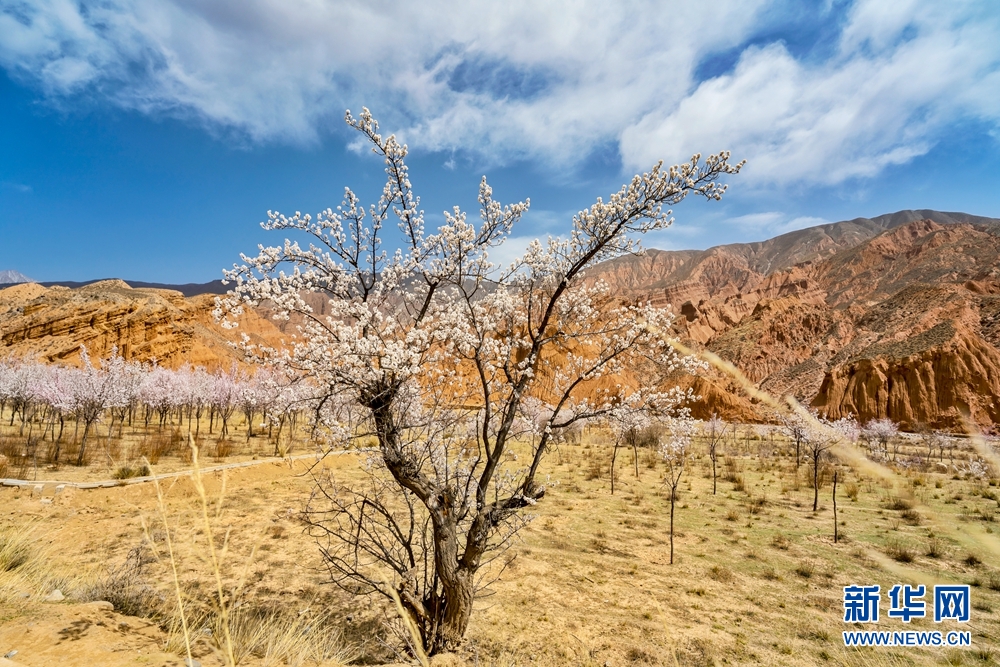 神奇的丹霞峽谷和一樹(shù)樹(shù)梨花構(gòu)成一幅色彩艷麗的油畫。新華網(wǎng) 宋忠勇 攝