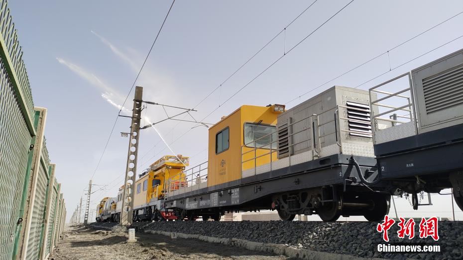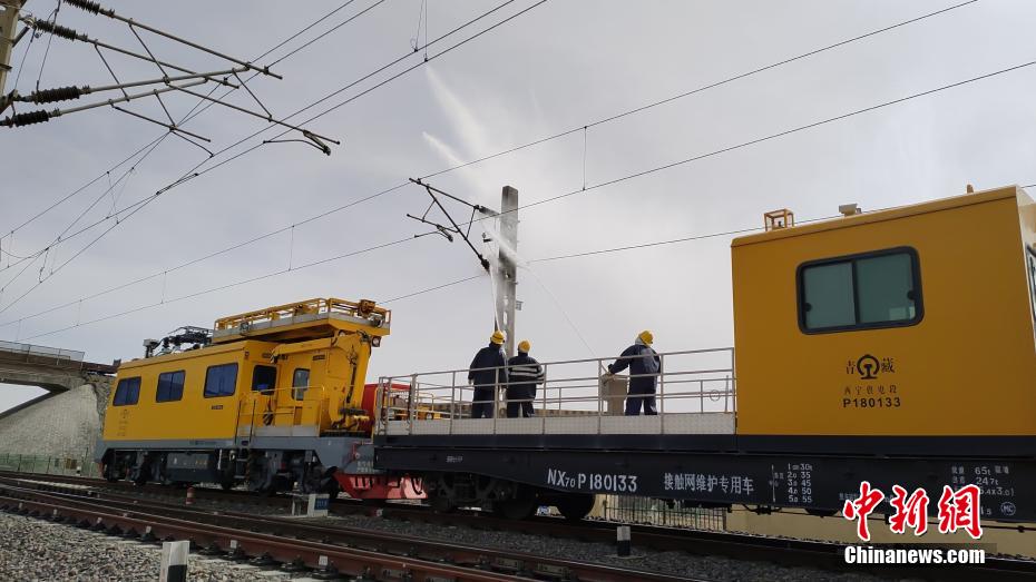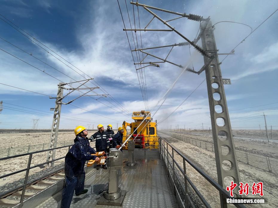 察爾汗鹽湖區(qū)域空氣中鹽分含量高,在這片區(qū)域,春秋季大風不僅揚沙還會揚鹽,很容易在鐵路牽引供電接觸網(wǎng)設備上形成鹽污,造成線路跳閘,遇到雨雪天氣就會放電,造成大面積跳閘,誘發(fā)行車安全事故。圖為接觸網(wǎng)工操作水炮進行清洗作業(yè)。 王文誠 攝