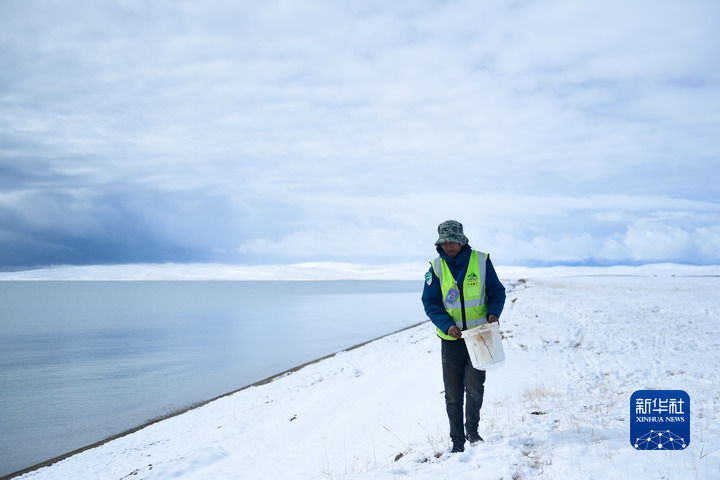2021年10月,三江源國家公園黃河源園區(qū)生態(tài)管護員俄措在扎陵湖邊撿拾垃圾。新華社記者 張龍 攝