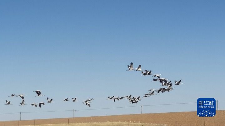 今年3月,青海果洛藏族自治州瑪多縣境內的三江源國家公園,蓑羽鶴在飛翔。新華社記者 呂雪莉 攝
