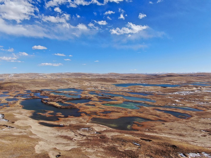 在青海省果洛藏族自治州瑪多縣境內(nèi)拍攝的一處濕地(無(wú)人機(jī)照片)。新華社記者 張龍 攝