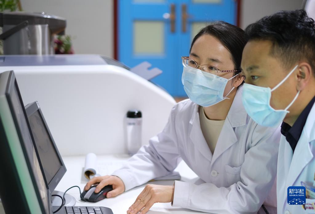 4月25日,青海省人民醫(yī)院醫(yī)生、青南支醫(yī)隊(duì)員王菲在青海省玉樹藏族自治州人民醫(yī)院給患者進(jìn)行檢查。新華社記者 韓方方 攝