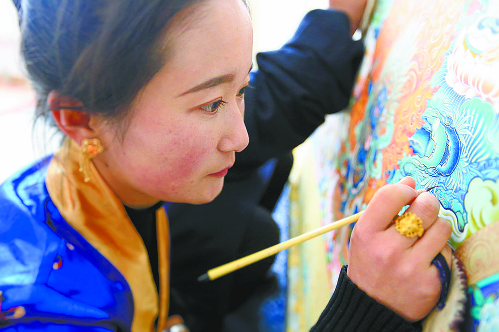 “唐卡”,被譽(yù)為世界上最繁瑣的工筆畫,圖為熱貢畫師繪制唐卡局部。
