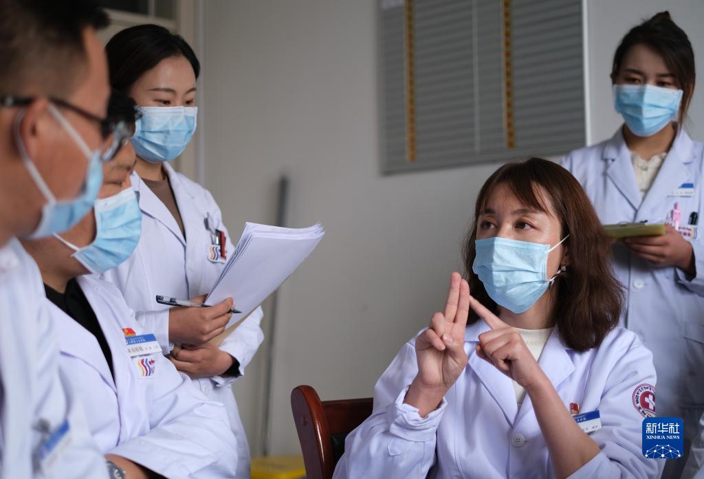 青海省人民醫(yī)院醫(yī)生、青南支醫(yī)隊員謝延玲(右二)和玉樹藏族自治州人民醫(yī)院醫(yī)生探討患者病情。新華社記者 央秀達(dá)珍 攝