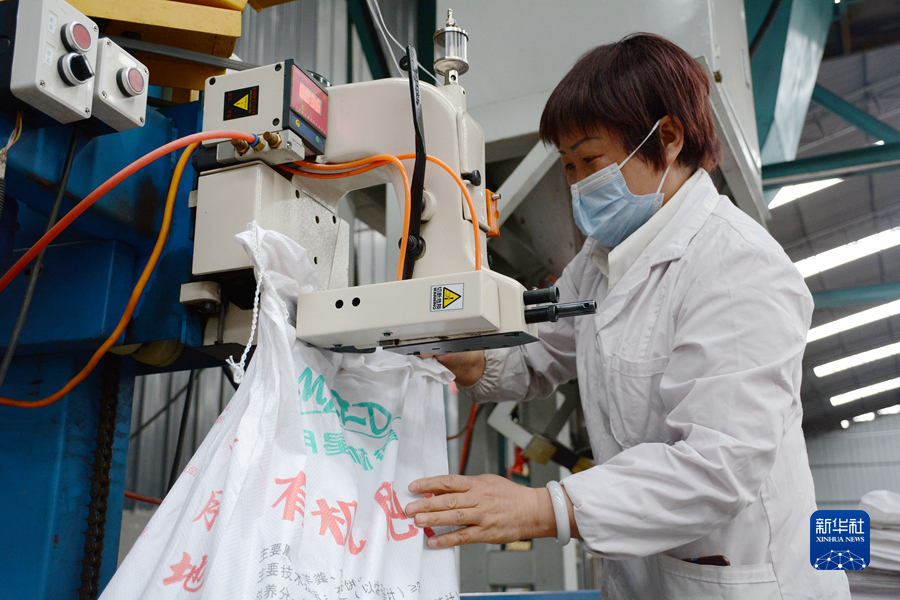 技術員王紅正在進行有機肥密封操作。新華社記者 柳澤興 攝