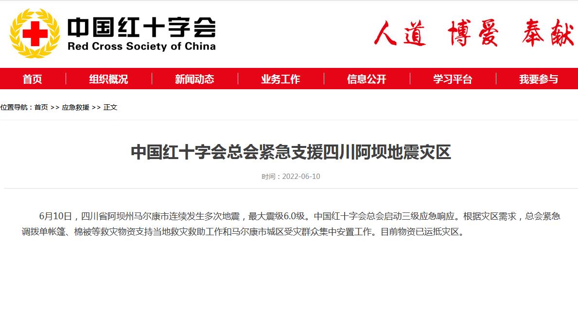 據(jù)中國紅十字會網(wǎng)站10日消息,6月10日,四川省阿壩州馬爾康市連續(xù)發(fā)生多次地震,最大震級6.0級。中國紅十字會總會啟動三級應(yīng)急響應(yīng)。根據(jù)災(zāi)區(qū)需求,總會緊急調(diào)撥單帳篷、棉被等救災(zāi)物資支持當(dāng)?shù)鼐葹?zāi)救助工作和馬爾康市城區(qū)受災(zāi)群眾集中安置工作。目前物資已運抵災(zāi)區(qū)。