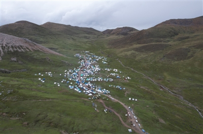 理塘縣共有8個蟲草產(chǎn)區(qū),阿加溝最大。這片山谷基礎設施已經(jīng)“不錯”,營地道路水泥硬化,兩條土公路修上了海拔5000米的山里。蟲草“淘金者”的主營地在一片開闊的山谷里,三面環(huán)山,山上覆著的一層淺綠的草甸。