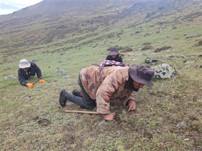 貢呷洛珠穿著棉襖,腿上綁著橡膠護膝,雙膝跪在草地上,俯身搜尋。與他結伴的是村里的恩珠夫妻倆,他們也趴著身子,不放過眼前的每一寸草地。