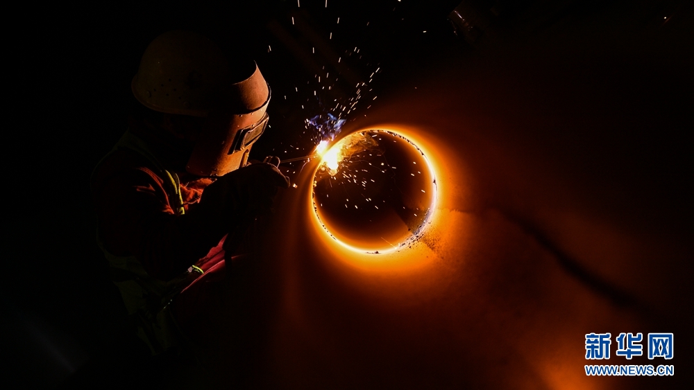 工人在地下廠房施工現(xiàn)場(chǎng)焊接管道。