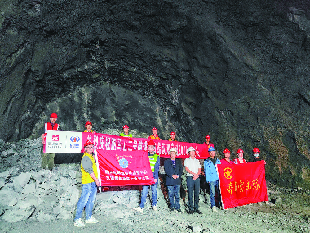 施工人員慶祝跑馬山二號(hào)隧道進(jìn)口端掘進(jìn)雙破2000米大關(guān)。