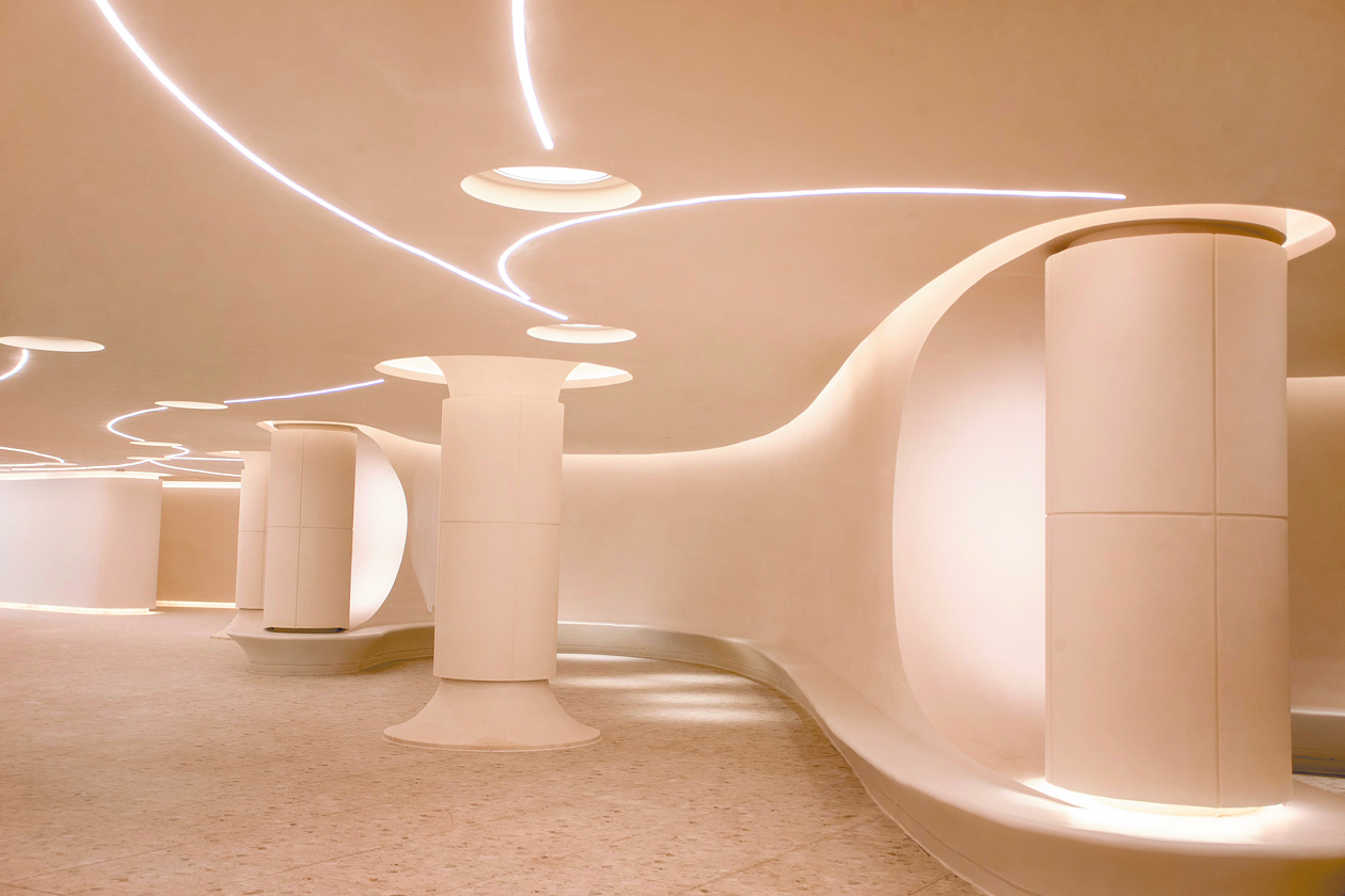 “看見九寨”大樓內(nèi)的10余個空間里,設(shè)計團隊用不同的色彩和科技表現(xiàn)手法表達(dá)出不同的舒緩風(fēng)格,治愈人心?!蔼氉孕褋怼彼囆g(shù)館運用弧形和曲線,將空間切割出曼妙的身形,輕盈靈動,淺黃柔色的燈光彌漫著溫柔氣息;以白色調(diào)為主的“九寨時光”圖書館,能讓人從浮躁中快速安靜下來。