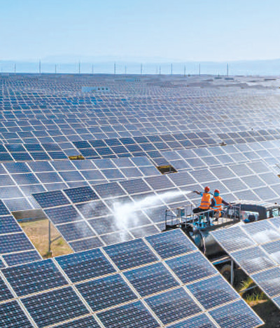 光伏產(chǎn)業(yè)園區(qū)內(nèi),工人在清洗光伏板。