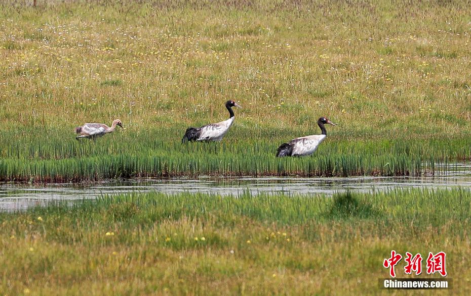 8月9日,祁連山南麓的青海省海北藏族自治州祁連縣央隆鄉(xiāng),三只黑頸鶴正在央隆濕地悠閑踱步,不時發(fā)出鳴叫聲。黑頸鶴是大型飛行涉禽,頸的上部為黑色,故稱黑頸鶴。每年,黑頸鶴在春季遷徙到繁殖地,秋季到達越冬地,是世界上唯一生長、繁殖在高原的鶴。