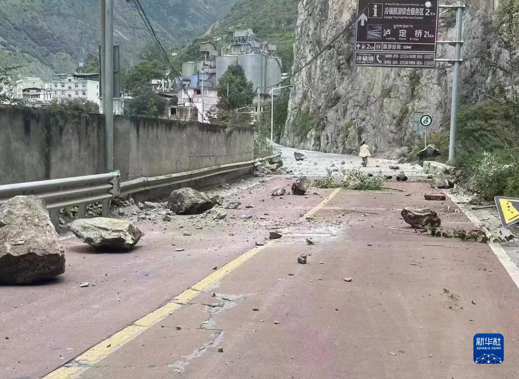山石掉落在四川省甘孜州瀘定縣冷磧鎮(zhèn)附近的道路上(9月5日攝)。新華社發(fā)