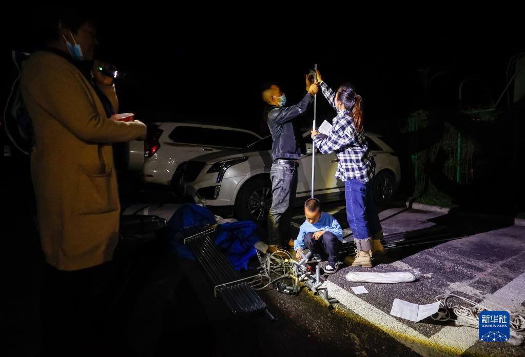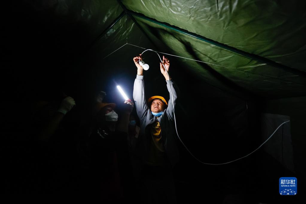 9月5日晚,在四川甘孜州瀘定縣磨西鎮(zhèn)的受災群眾臨時安置點,工作人員安裝電燈。新華社 沈伯韓 攝