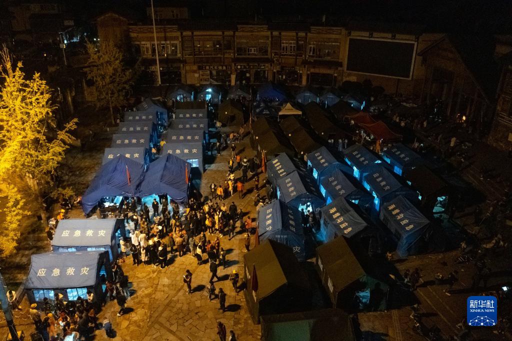 9月5日晚在四川甘孜州瀘定縣磨西鎮(zhèn)拍攝的受災群眾臨時安置點(無人機照片)。新華社 沈伯韓 攝