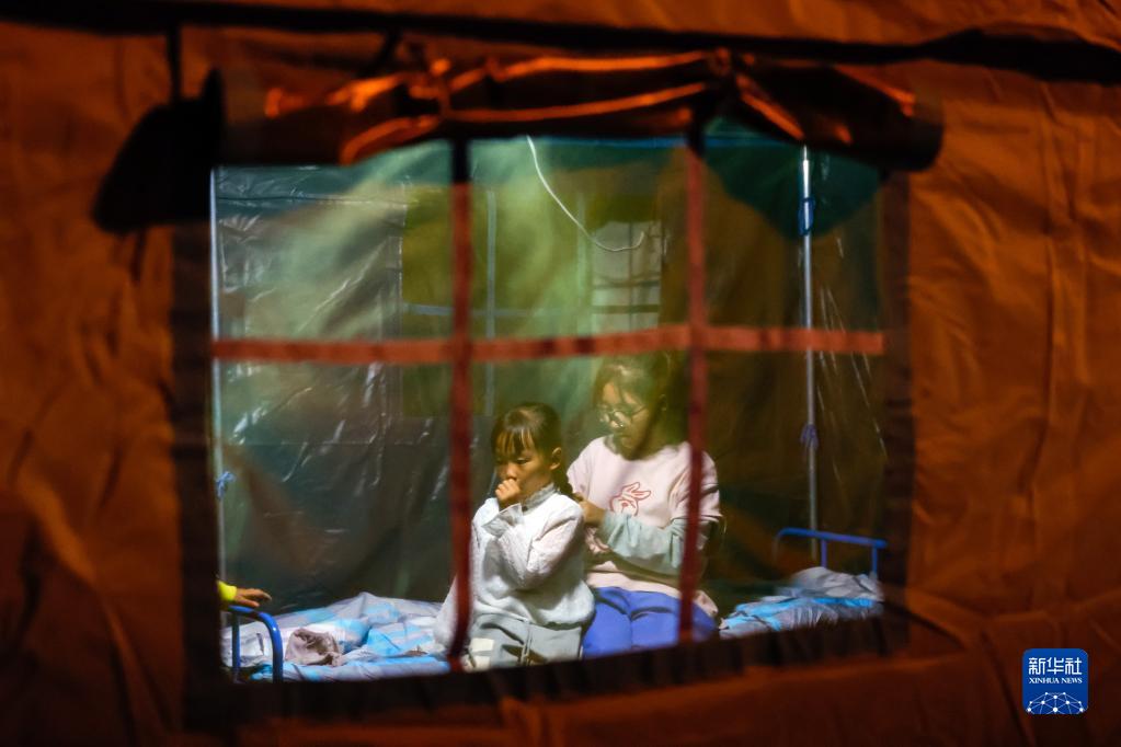 9月5日晚,在四川甘孜州瀘定縣磨西鎮(zhèn)受災群眾臨時安置點,兩名小女孩在帳篷里。新華社 沈伯韓 攝