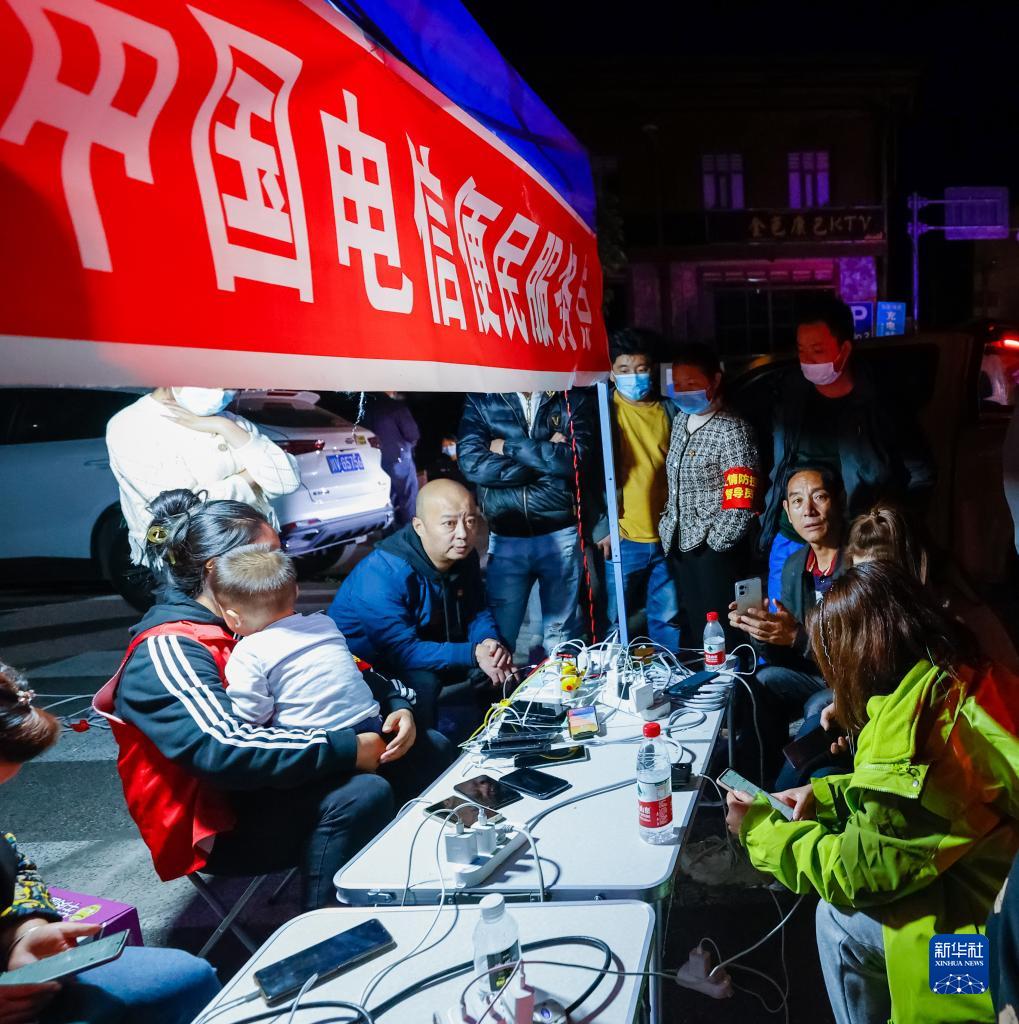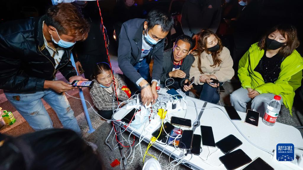 9月5日晚,在四川甘孜州瀘定縣磨西鎮(zhèn)的受災群眾臨時安置點,人們在中國電信便民服務點為手機充電。新華社 沈伯韓 攝