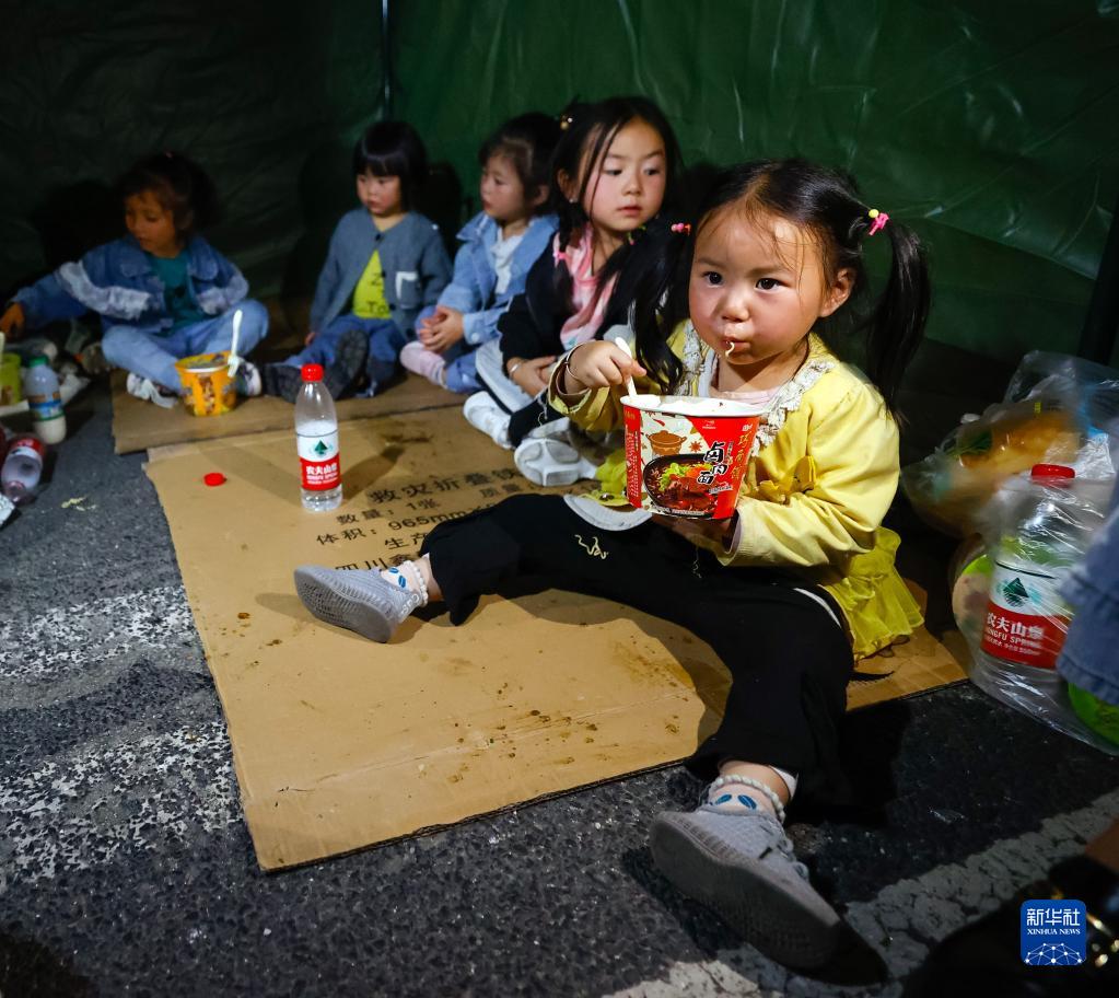 9月5日晚,在四川甘孜州瀘定縣磨西鎮(zhèn)的受災群眾臨時安置點,幾個家庭的孩子們在一個帳篷里吃飯、休息。新華社 沈伯韓 攝