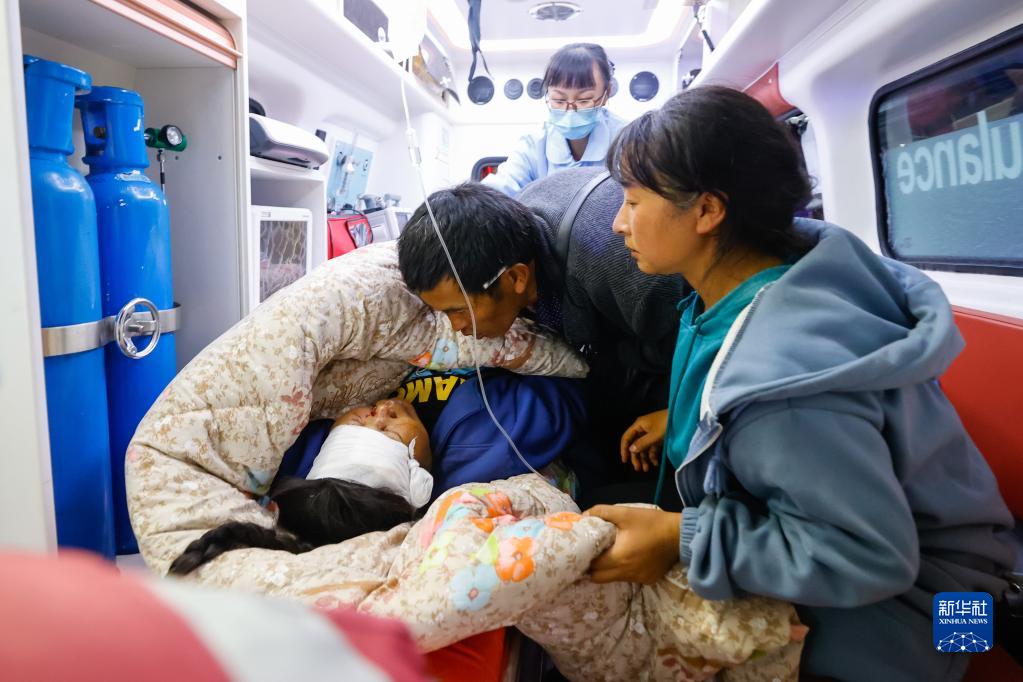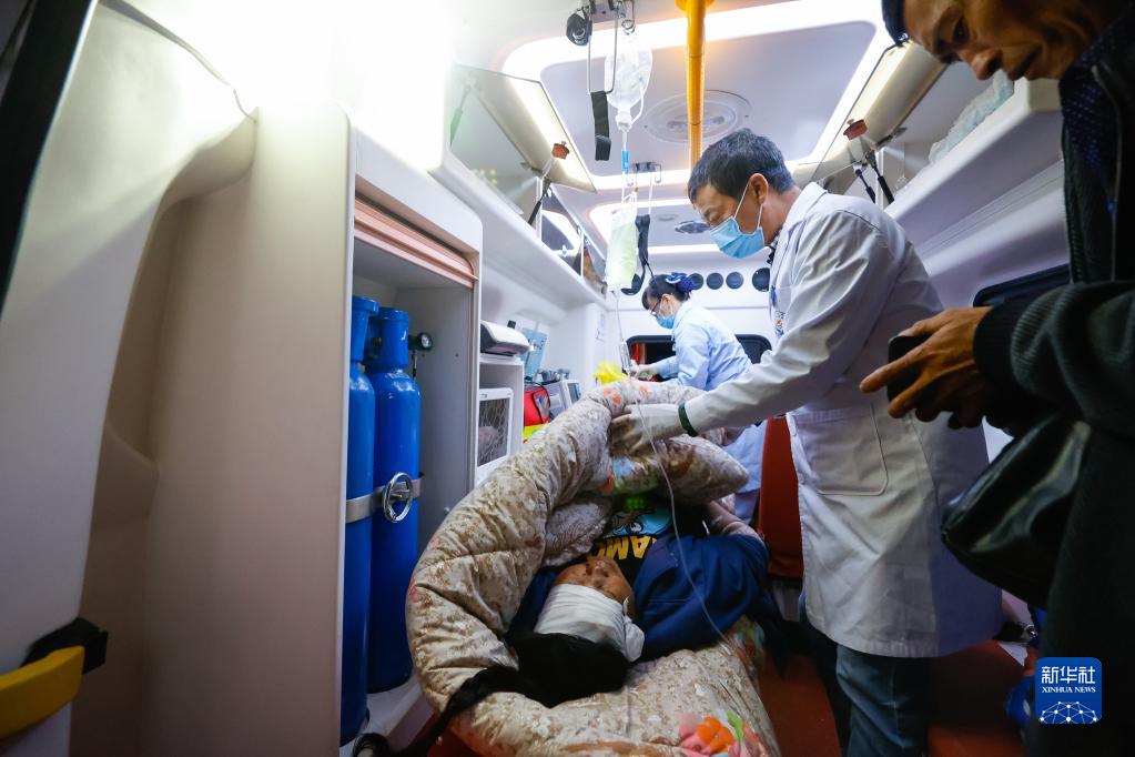 9月5日晚,在四川甘孜州瀘定縣磨西鎮(zhèn)的受災群眾臨時安置點,人們轉(zhuǎn)運受傷群眾。新華社 沈伯韓 攝