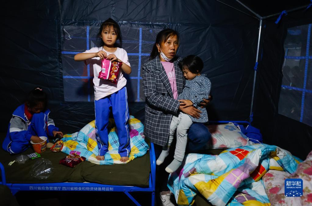 9月5日晚,在四川甘孜州瀘定縣磨西鎮(zhèn)的受災群眾臨時安置點,受災群眾在帳篷里。新華社 沈伯韓 攝