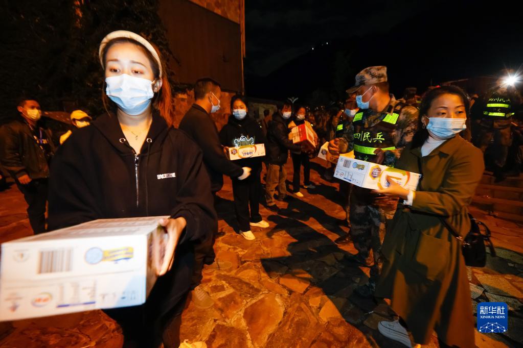 9月5日晚,在四川甘孜州瀘定縣磨西鎮(zhèn)的受災群眾臨時安置點,人們在傳遞救災物資。新華社 沈伯韓 攝