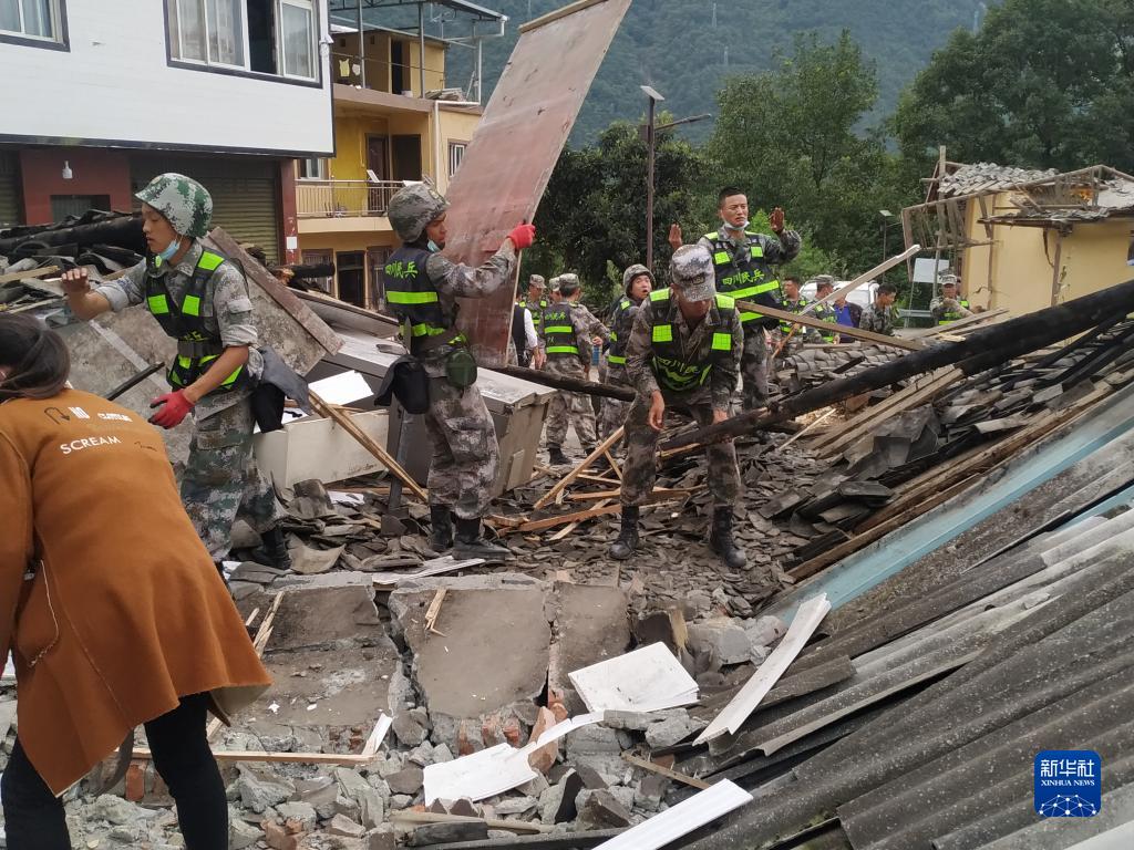 9月6日,四川瀘定縣人武部組織民兵在磨西鎮(zhèn)磨子溝村進行清理作業(yè)。新華社發(fā)(冉培宗 攝)