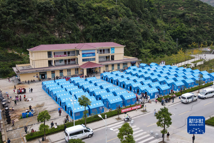 這是9月6日拍攝的位于石棉縣王崗坪鄉(xiāng)挖角村村委會的安置點(無人機照片)。新華社記者 胥冰潔 攝