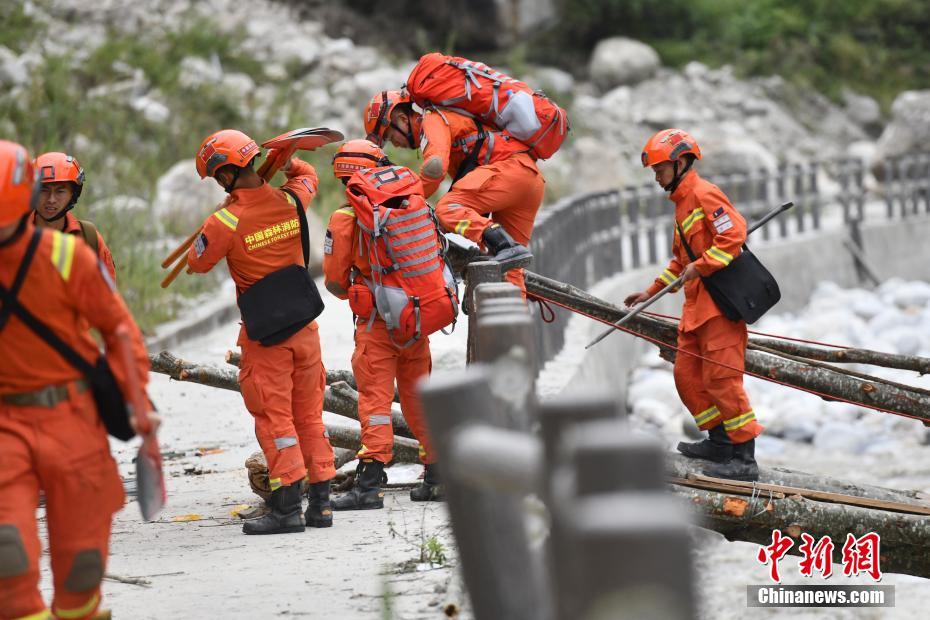 9月6日,四川甘孜州瀘定縣磨西鎮(zhèn),甘孜州森林消防支隊(duì)康定中隊(duì)隊(duì)員在木橋旁護(hù)送村民。 中新社記者 張浪 攝