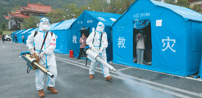9月6日,武警四川總隊醫(yī)院醫(yī)護(hù)人員在瀘定縣磨西鎮(zhèn)臨時安置點(diǎn)開展消殺工作。李華時 攝(人民圖片)