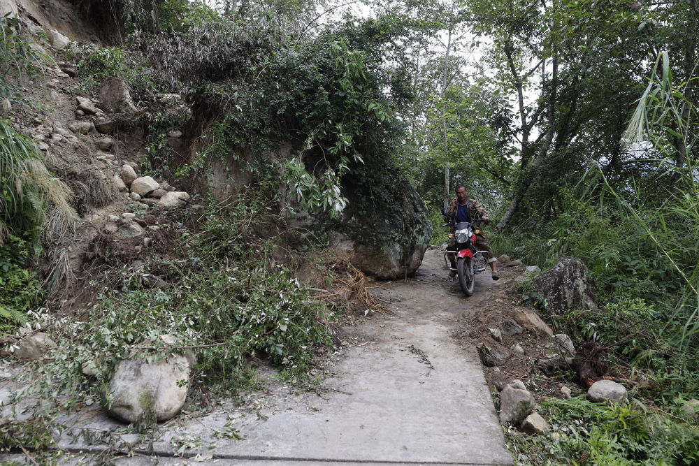 9月8日,青崗坪村村民騎著摩托車(chē)通過(guò)被滾落的山石阻擋的上山路。
