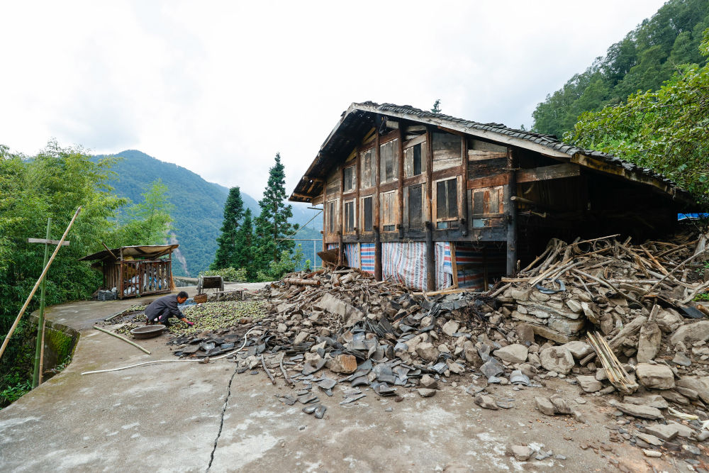 9月8日,共和村一組被地震損壞的民房。旁邊坍塌的山體本是盤(pán)山公路,如今已隱入山中不復(fù)存在。