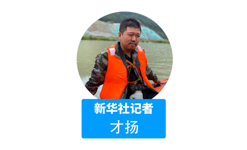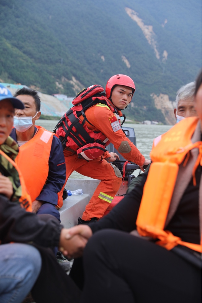 大渡河水奔涌流去,但穿梭于各個(gè)村莊間的救援人員毫無(wú)畏懼。我們隨救援人員一起坐上沖鋒舟,兩岸的山上不斷有滾石滑落。