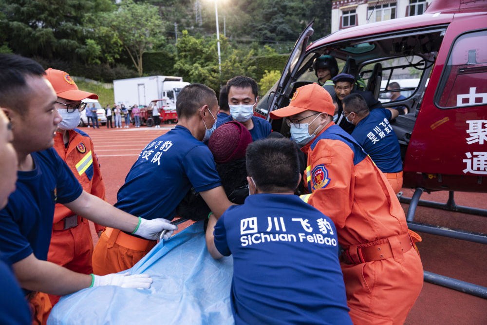 9月6日,在石棉縣中學(xué)的臨時(shí)起降點(diǎn),救援人員在運(yùn)送一名從石棉縣幸福村轉(zhuǎn)運(yùn)來(lái)的受傷老人。
