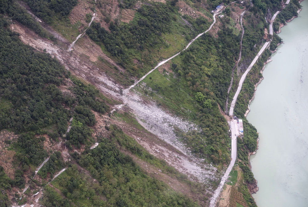 9月8日,在去往共和村的路上拍攝的盤(pán)山路塌下來(lái)形成的塌方。